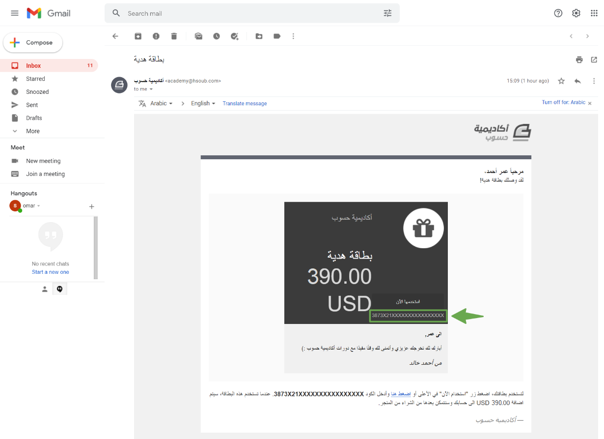 في حال اختيارك مشاركة البطاقة مع المستلم عبر البريد الإلكتروني، سيتم إرسالها بالشكل الموضح في الصورة، سيتم تزويد المستخدم برقم البطاقة ومعلومات عن المرسِل وطريقة الاستخدام، بالإضافة لرسالتك التي قمت بإدراجها في الخطوات السابقة.